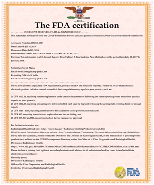e、美国FDA认证。美国FDA全称是:美国食品和药物管理局(Food and Drug Administration).美国FDA规定,X射线相关设备,必须遵守安全辐射泄漏标准为:<=0.5mR/Hr. Unicomp在08年已经取得FDA认证,认证编号为:0810141-000