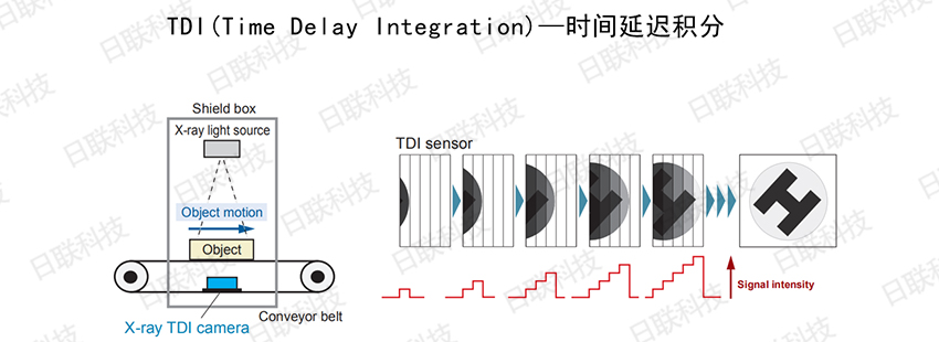 就普通线阵成像器来说,线阵成像器的成像区域如第一幅图,可以理解为一条线,但TDI则不止,它有好几条线并列来进行成像,如上图右边TDI sensor中有五条线,当物体移动时每条线都在取图,**进行整合。可以简单理解为:多条线阵,每条线阵检测取图后将数据叠加,可以看作物体被检测曝光了多次,增加了有效信息,因此相较传统LDA动态范围宽,响应度高,且即使在光线较暗的场所,也能输出质量较高的图像。