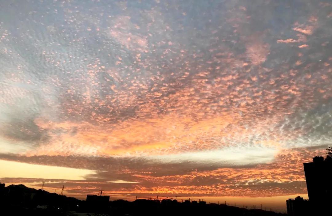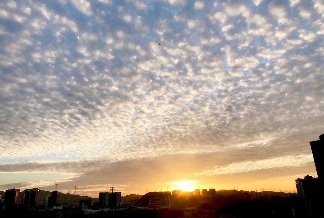 让人纷纷拿起手机记录下这旭日烟云的天空。