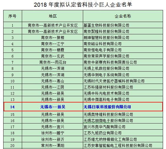 近日,江苏省专精特新小巨人企业拟认定名单在江苏省经信委网站公示,此资质经过企业申报、各地经信部门审核推荐、第三方机构审查、专家评审等环节,无锡市共有10家单位入选“江苏省科技小巨人企业”,无锡金年会科技股份有限公司荣获榜单。这也是江苏省认定一批具有一定规模、创新性强、增长潜力大的创新型企业,推动江苏省经济转型升级的中坚力量。