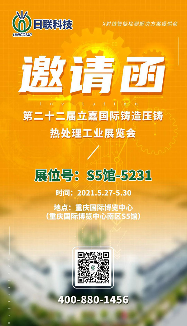 第 22 届立嘉国际铸造压铸热处理工业展将于 2021年5月27至30日在重庆国际博览中心举行。金年会科技位于S5馆5231展位,此次将展出UNC系列X射线智能检测设备。